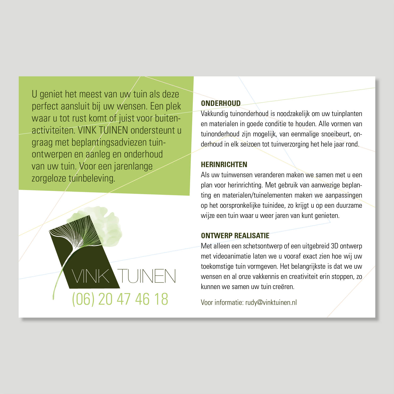 Voor VINK TUINEN mocht ik de complete huisstijl vervangen en het bedrijf de uitstraling geven die bij hun doelstellingen past. Van visitekaart tot en met de vervoersmiddelen zijn allemaal uitgevoerd.